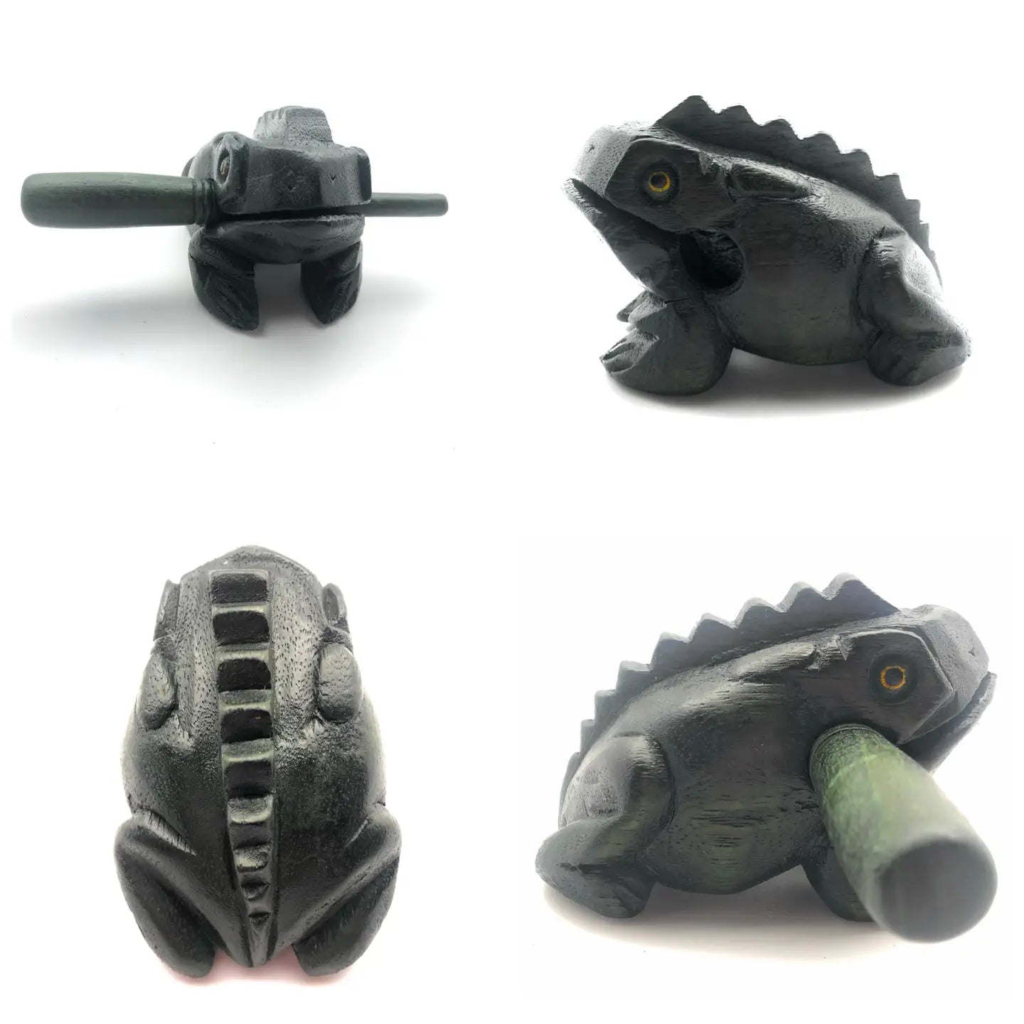 Green waxed croaking singing musical frog drum rasp. A great musical instrument percussion toy from wood that makes a “ribbit” sound when you rub the included striker up its back.