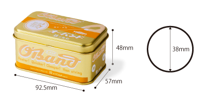 A reusable gold tin with rubber bands in 8 vibrant colors - light blue, light green, orange, pink, red, violet, yellow and chocolate. Natural rubber.