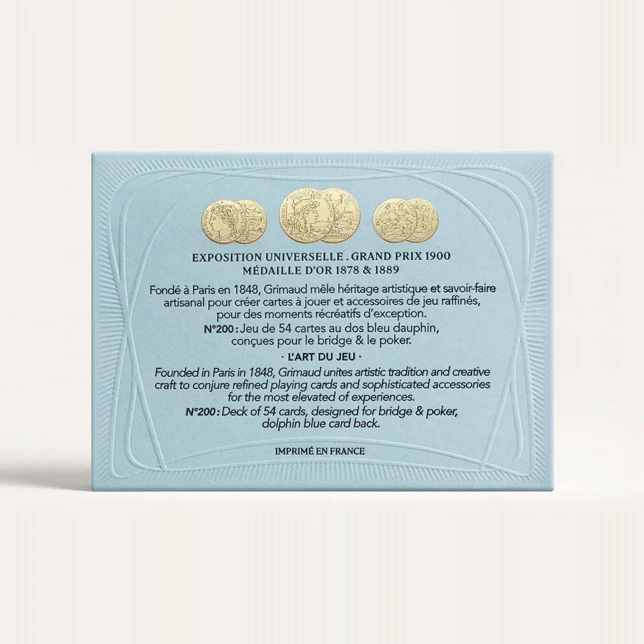 All Grimaud cards feature the statement gold gilded corners introduced by Baptiste Paul Grimaud, who not only pioneered rounded corners but also added gilding to make the cards more resilient to drops and crimping.