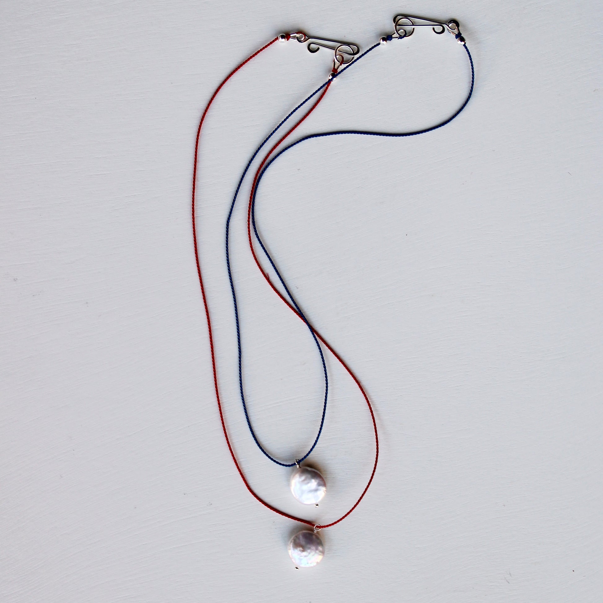 Freshwater coin Pearl on Silk thread. Sterling silver metal. Complete with hand forged hook and eye. Made to be layered.