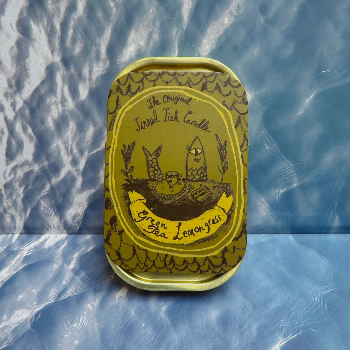 Our bestselling tinned fish candles just got a fresh new look! This one opens with a crisp, citrusy blend of green tea and lemongrass. Inside the tin, green-on-green sardines nestle together—an illustrated story unfolds on the packaging. Still handmade in Atlanta and still peels open like the real thing, now with upgraded easy-open packaging. Soy Wax Blend. Hand poured, sealed, and packaged.